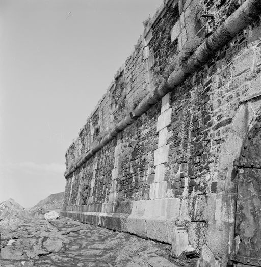 Vue de la batterie de Cornouaille en 1969 : escarpe, chaînes harpées en pierres de taille de graniteImmatriculation