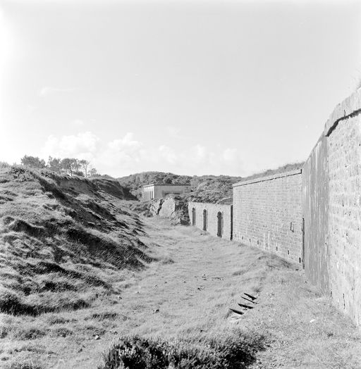 Vue de la batterie de Kerviniou en 1969 : route de service en tranchée au sud-ouest. Au premier plan à droite : magasin à munitions en béton armé. Au fond, bâtiments annexes : magasins, usine électrique etc.Immatriculation