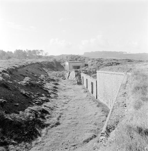 Vue de la batterie de Kerviniou en 1969 : route de service en tranchée au sud-ouest. Au premier plan à droite : magasin à munitions en béton armé. Au fond, bâtiments annexes : magasins, usine électrique etc.Immatriculation