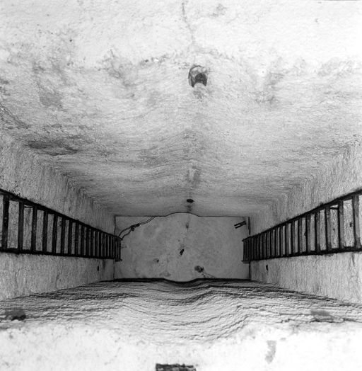 Vue de la batterie haute de la pointe Robert en 1969 : magasin à poudre sous roc, espace du monte-chargeImmatriculation