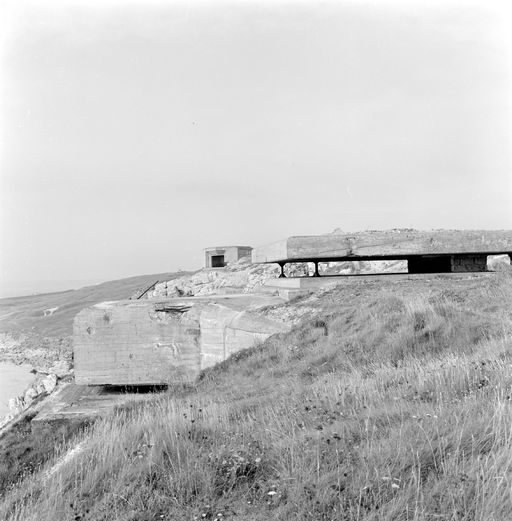 Vue de la batterie de Kerbonn en 1969 : observatoires du bunker - poste de direction de tir de type M162a. En arrière-plan : bunker - casemate pour canon de 164,7 mmImmatriculation