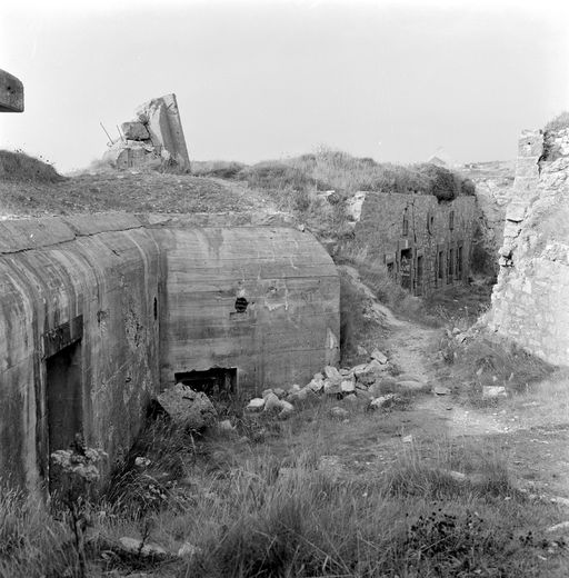 Vue de la batterie de Kerbonn en 1969 : façade arrière du poste de direction de tir de type M162a et créneau de défense d'entréeImmatriculation