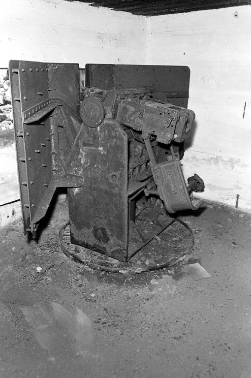 Vue de la batterie de rupture de Pourjoint en 1969. Les embrasures ont été coiffées par deux casemates pour canon antichars durant la Seconde Guerre Mondiale. Embrasure (ici ouest) dite à gradin encore dotée de son canon anticharsImmatriculation