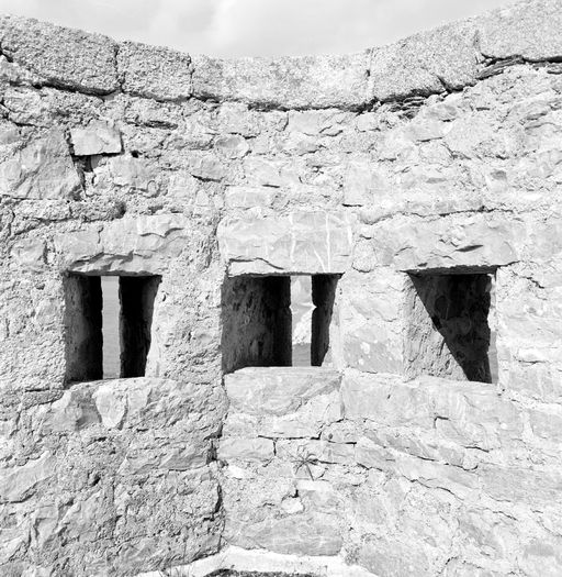 Camaret-sur-Mer, pointe du Toulinguet : vue de la tour-modèle n° 3 en 1969, terrasse, parapet percé de créneaux de fusilladeImmatriculation