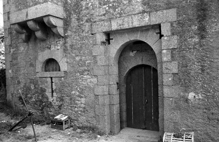 Vue du corps de garde crénelé n° 3 du bourg de Roscanvel en 1969 : porte d'entrée. A noter : la feuillure d'encastrement du pont-levis et le passage des chaînes de manoeuvreImmatriculation