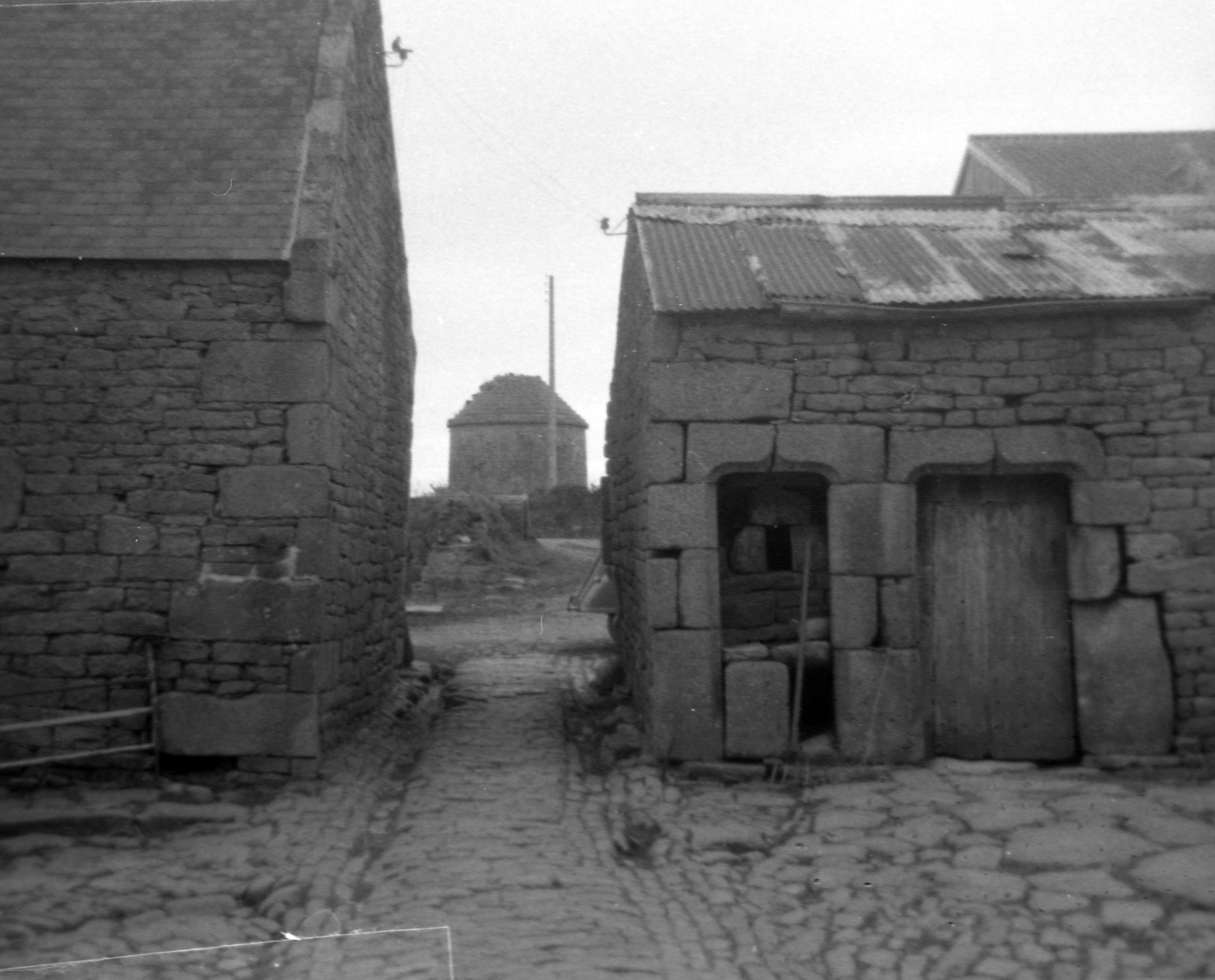 Chemin d'accès empierré et dépendances, photographie de 1969. En arrière-plan, le colombier (axe sud-sud-ouest)Immatriculation