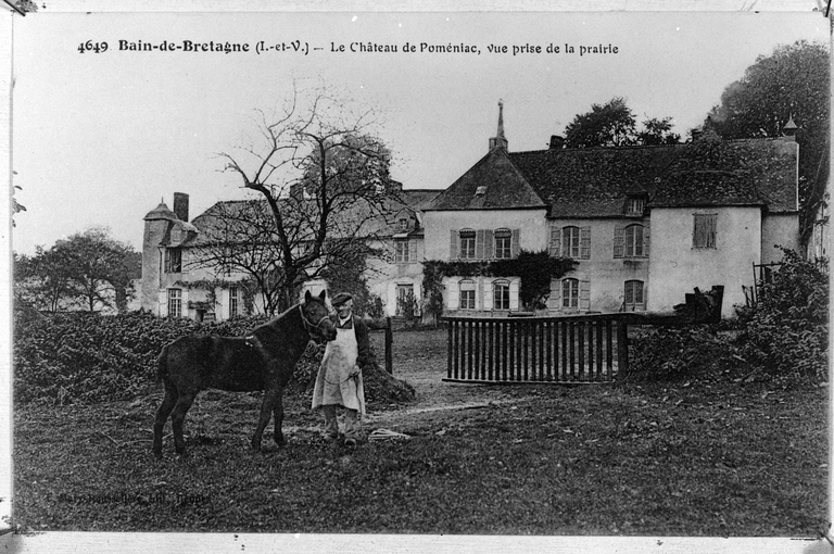 Carte postale ancienne - 4649 - Bain-de-Bretagne (I.-et-V.) - Le château de Poméniac vue prise de la prairie.Immatriculation