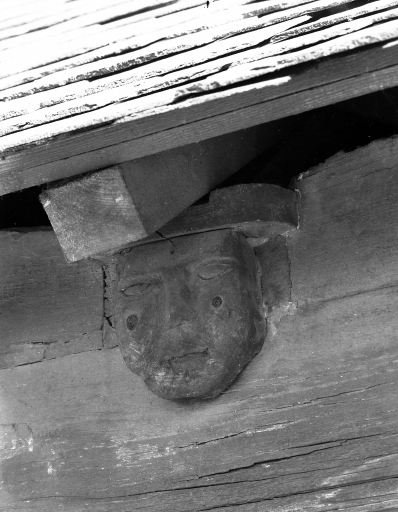 Galerie sud : sablière extérieure, blochet sculpté à l'ouest de l'entréeImmatriculation