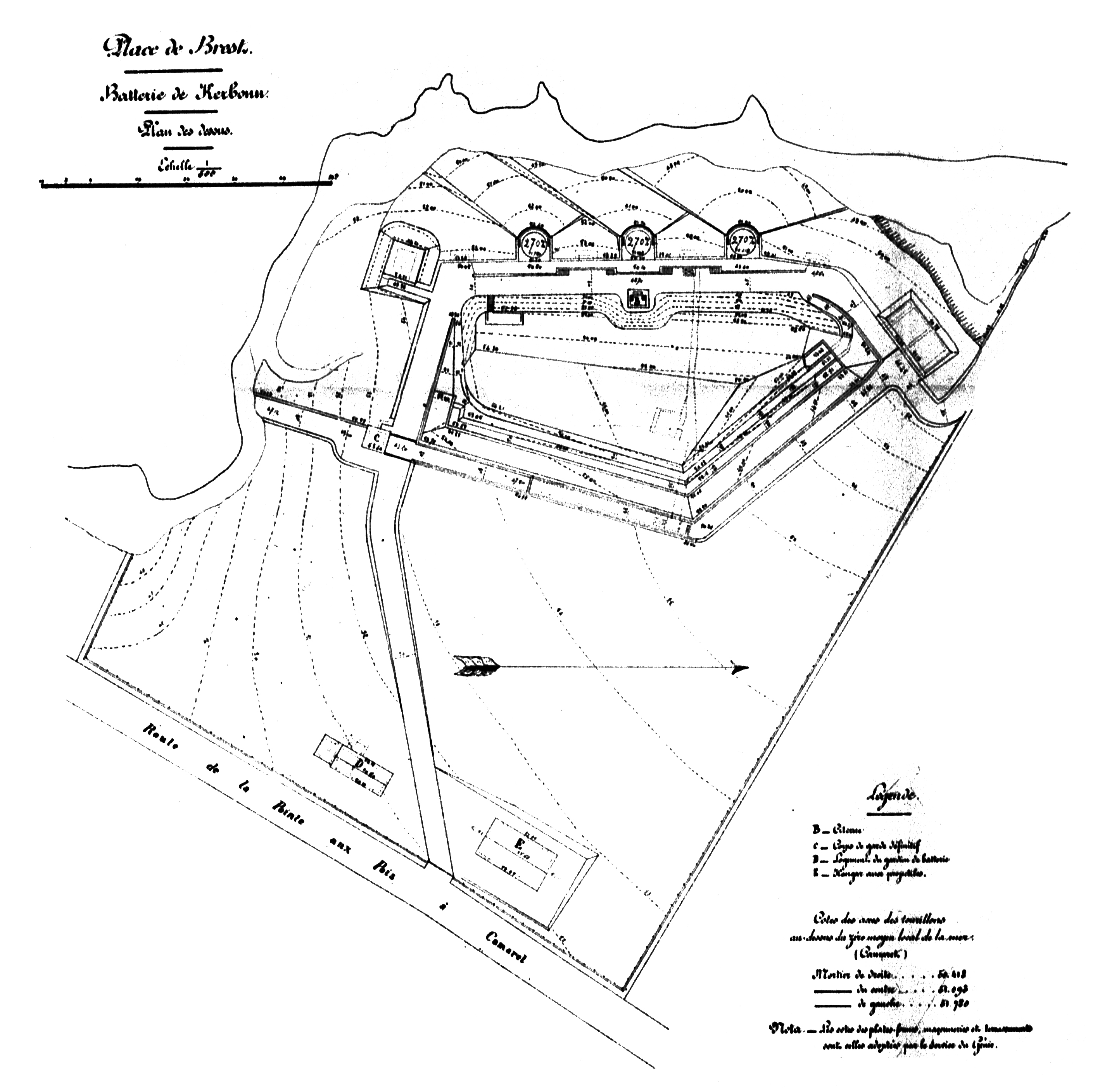 Plan de la batterie de Kerbonn, extrait de l'Atlas des batteries de côte (trois mortiers lourds rayés de calibre 270 mm, modèle 1889 sur affûts Vavasseur et Canet)Immatriculation