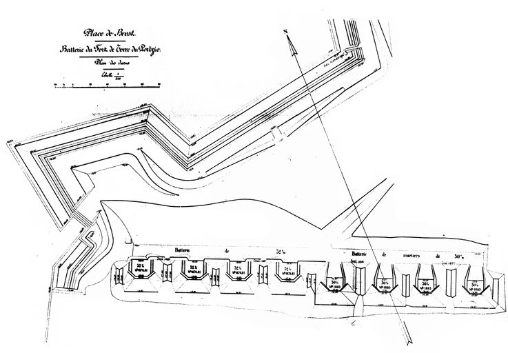 Plan de situation des batteries du fort de terre (4 canons de 32 cm modèle 1870-1881 sur affûts M modèle 1882 PA, 4 mortiers de 30 cm modèle 1883 sur affûts M modèle 1883 PA)Immatriculation