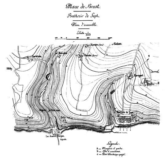 Plan de situation de la batterie de Sept (4 canons M de 32 cm modèle 1870 M sur affûts modèle 1876-T-1883) et du magasin au fulmicoton, Direction d'Artillerie du génie de Brest, fin 19e siècleImmatriculation