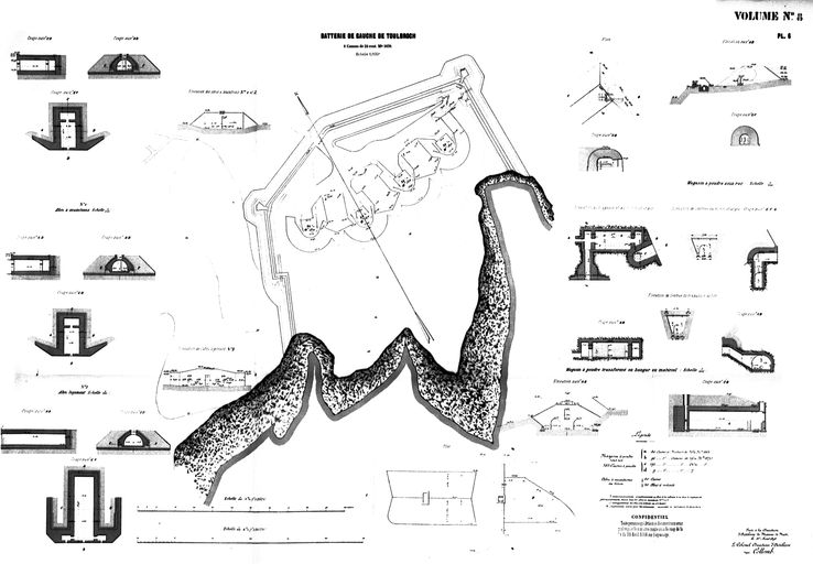 Plan de la batterie de 24 cm modèle 1870, Direction d'Artillerie du génie de Brest, 1893, par le colonel Directeur d'Artillerie : CollombImmatriculation