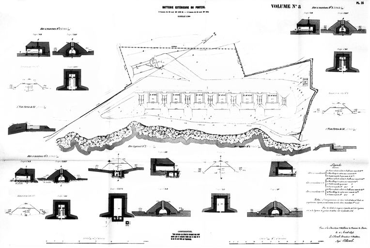 Plan et coupes de la batterie extérieure du Portzic (2 canons de 32 cm modèle1870-1879, 4 canons M de 24 cm modèle 1870), Direction d'Artillerie du génie de Brest, 1893, par le colonel Directeur d'Artillerie : CollombImmatriculation