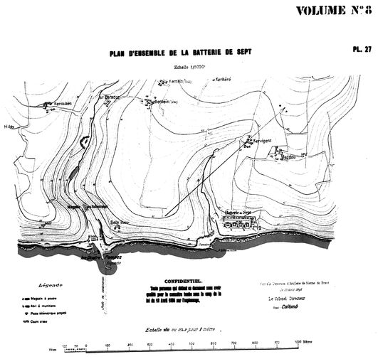 Plan de situation de la batterie de Sept (4 canons M de 32 cm modèle 1870 M sur affûts modèle 1876-T-1883) et du magasin au fulmicoton, 1895, par le colonel Directeur d'Artillerie : CollombImmatriculation