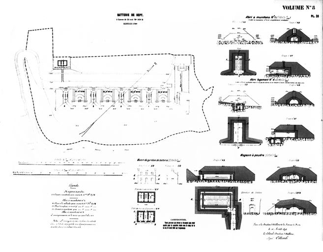 Plan et coupes de la batterie de Sept (4 canons M de 32 cm modèle 1870 M sur affûts modèle 1876-T-1883), Direction d'Artillerie du génie de Brest, 1895, par le colonel Directeur d'Artillerie : CollombImmatriculation
