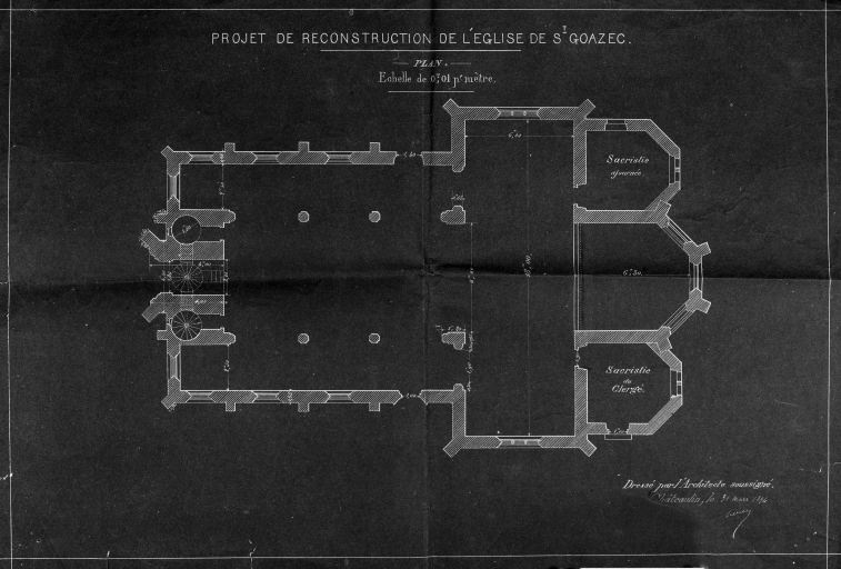 Saint-Goazec, église paroissiale Saint-Pierre : reproduction de 1970, plan au sol : projet de reconstructionImmatriculation
