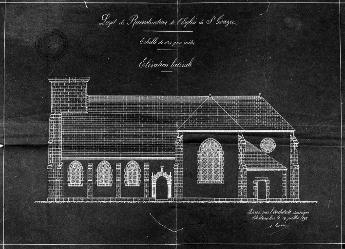 Saint-Goazec, église paroissiale Saint-Pierre : reproduction de 1970, élévation sud : projet de reconstructionImmatriculation