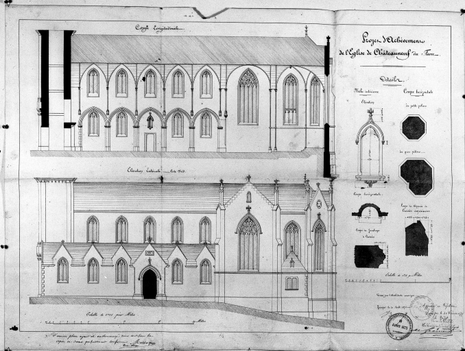 Châteauneuf-du-Faou, église paroissiale Saint-Julien et Notre-Dame : projet d'achèvement de l'église par Boyer, 1876 (coupe longitudinale, élévation sud Reproduction A.D. Finistère, IV, 307 de 1970)Immatriculation