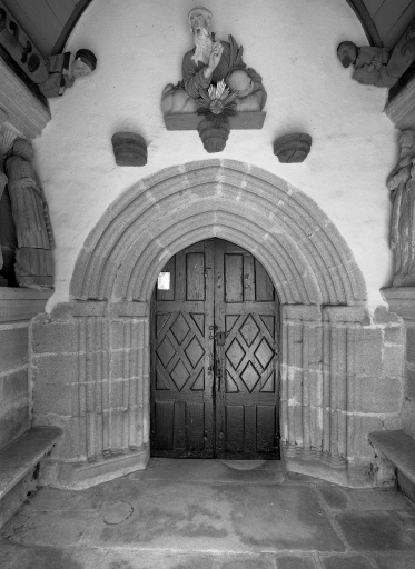 Plomodiern, église paroissiale Saint-Mahouarn : porche sud, vue de la porte nord sur bas-côté, état en 1970Immatriculation