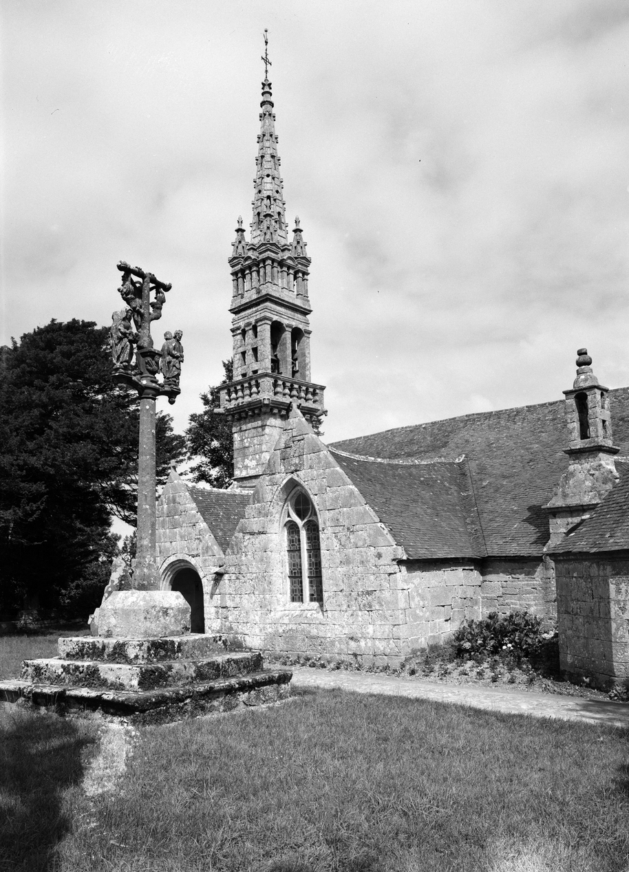 Calvaire, clocher, porche et transept bras sud, vue prise du sud-est.Immatriculation