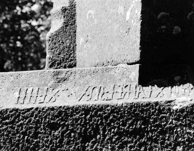 Calvaire, détail inscription, mur pignon sud de la nefImmatriculation