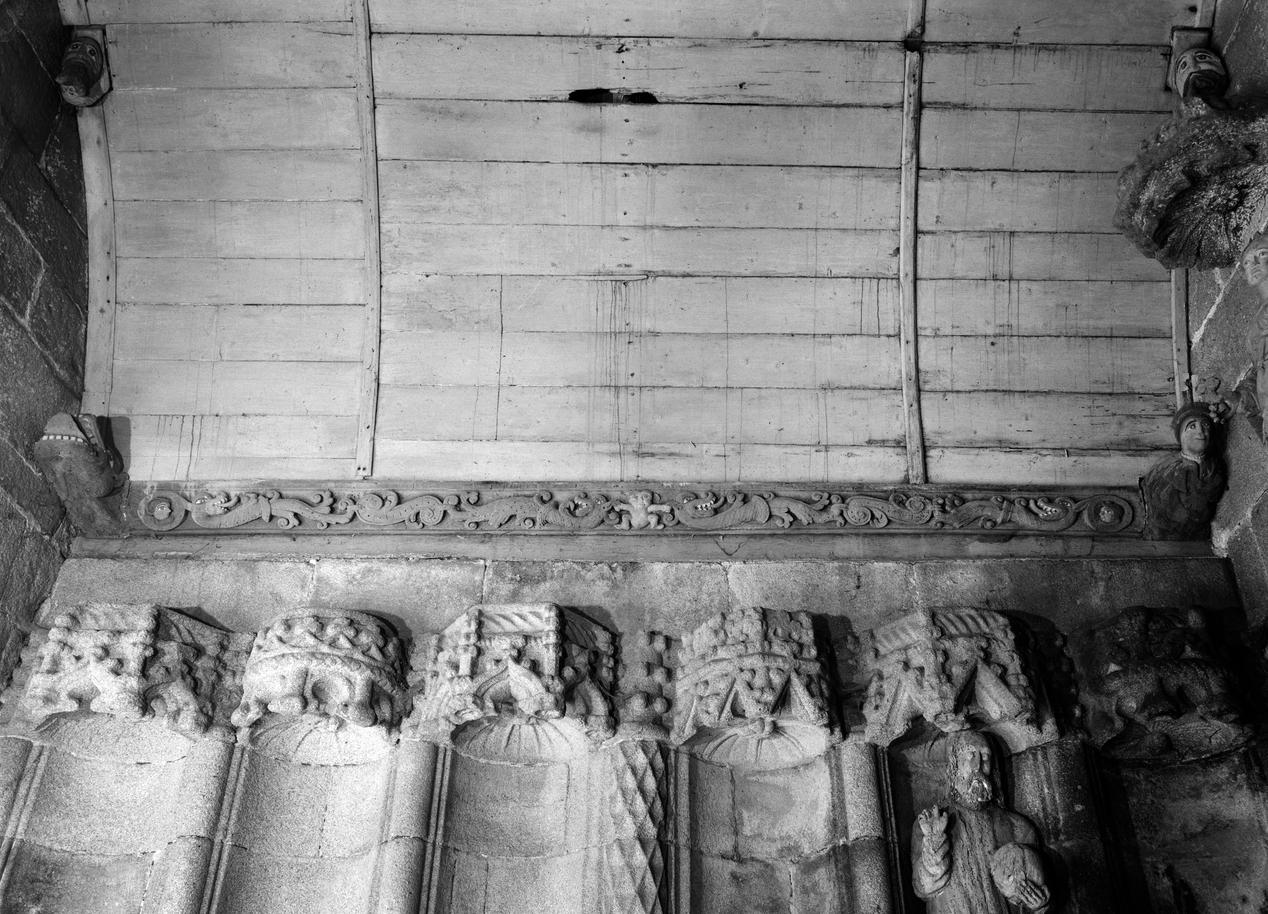 Porche sud, mur ouest, détail dais et sablière.Immatriculation