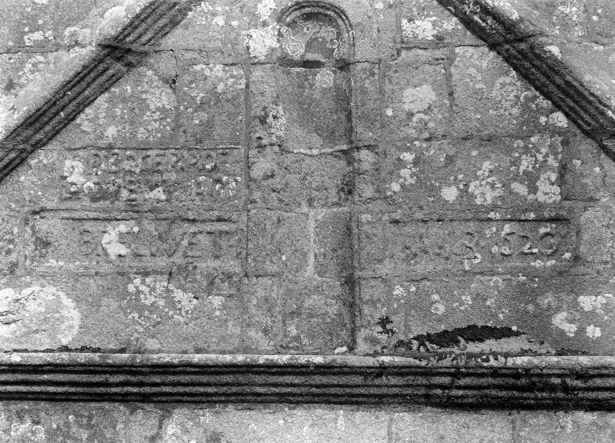 Façade ouest, détail inscription du fronton et nicheImmatriculation