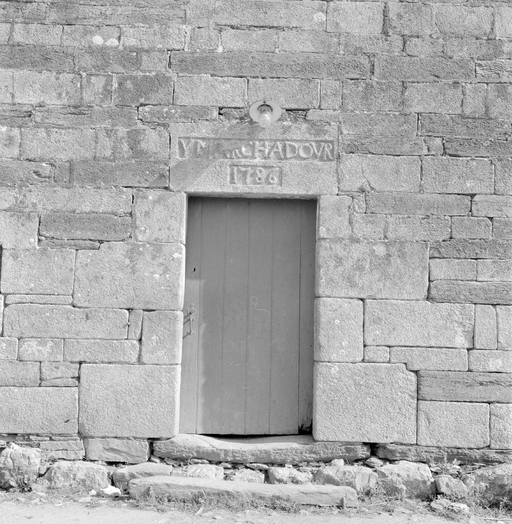 Logis, porte centrale de la façade sud-ouest, détail inscription sur le linteauImmatriculation