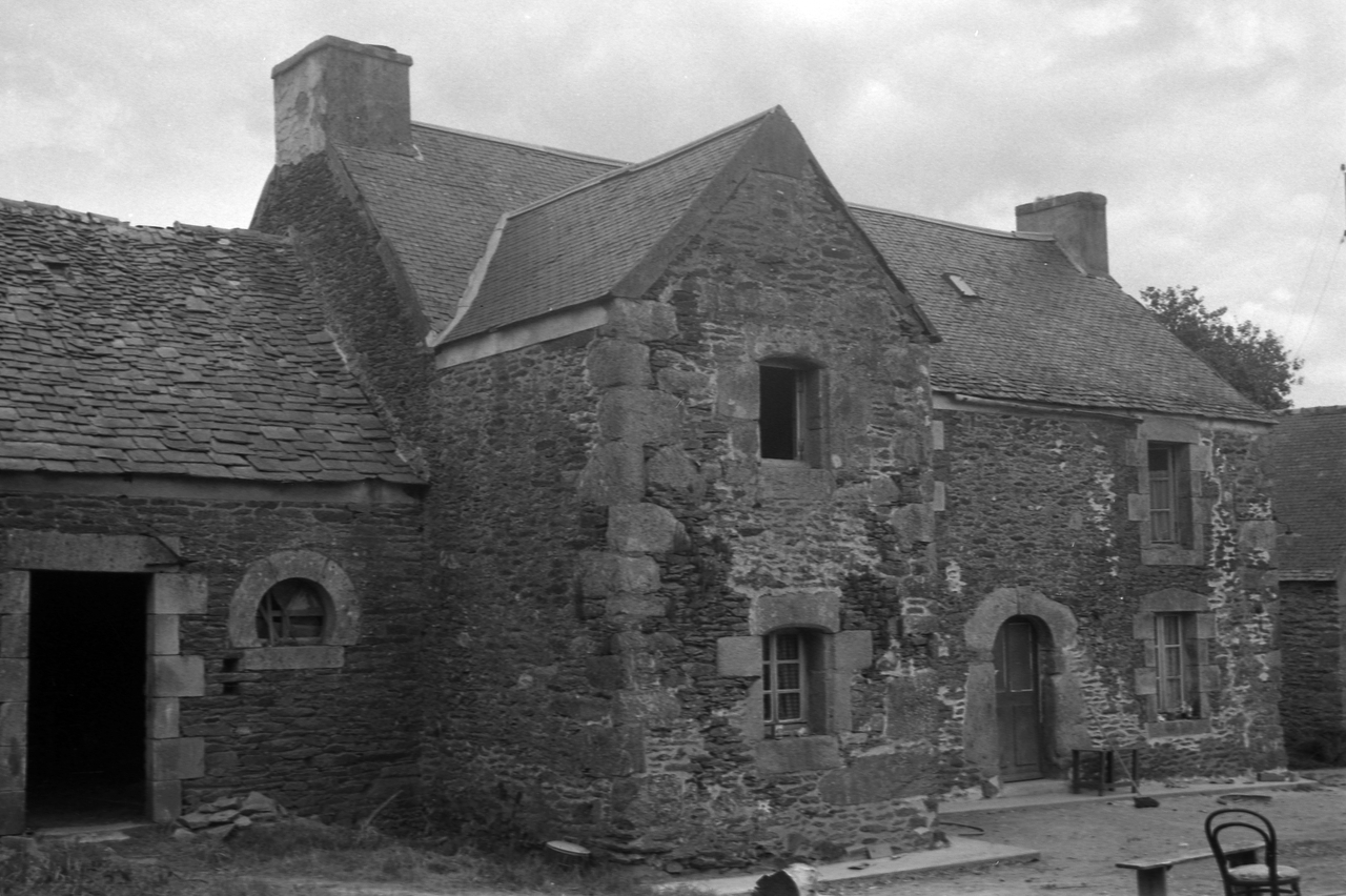 Plougonven, Kervoazou Pen an run, maison à avancée, inscription LE GOFF/1780 sur la cheminée (état 1970)Immatriculation
