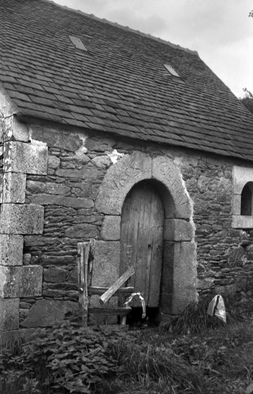 Plougonven, Pen ar Quinquis, date portée 1655, inscription G/BENIA. Rigole à purin traverse la maison. (état 1970)Immatriculation