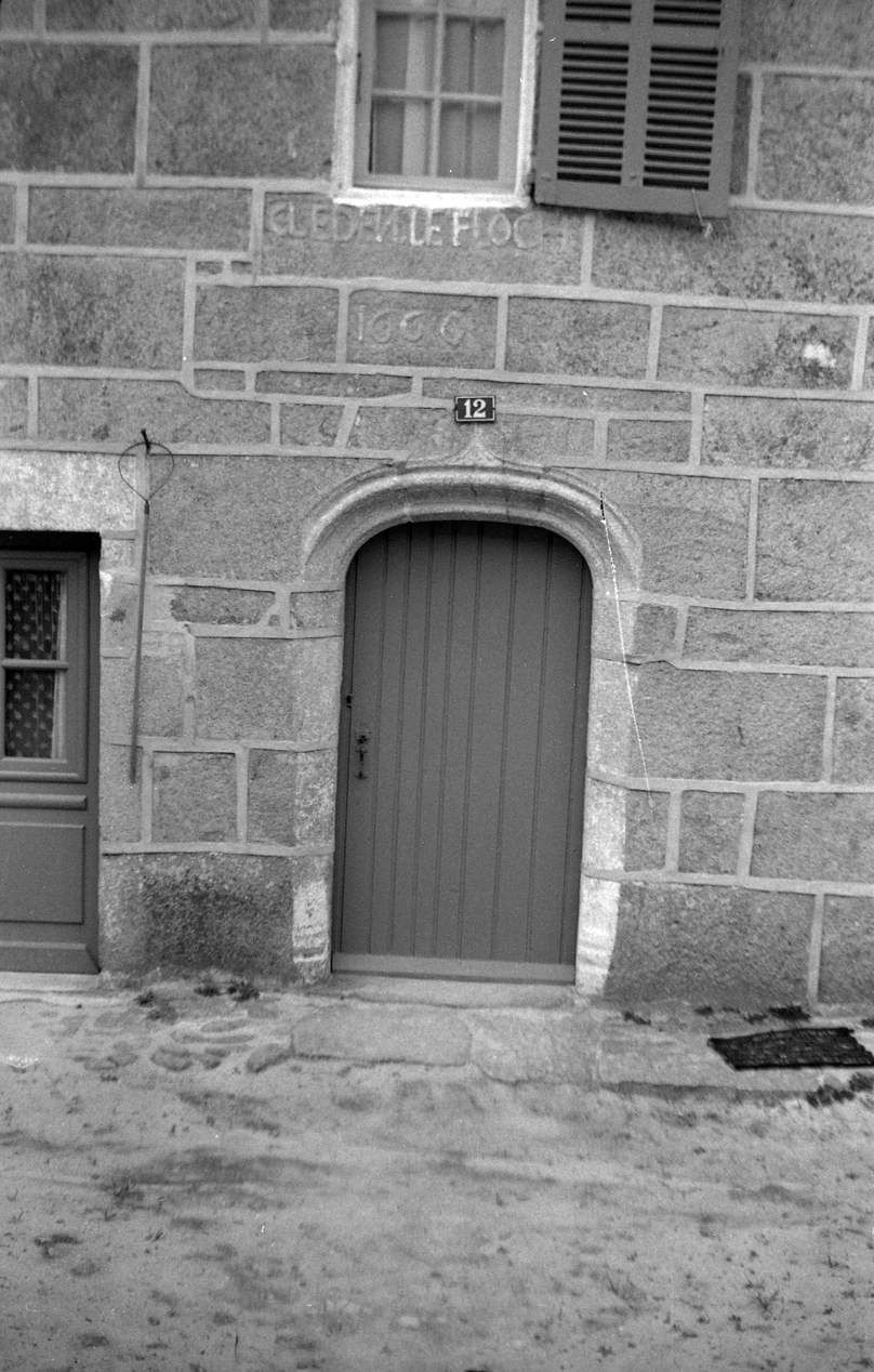 Elévation antérieure est, détail de la porte d'entrée et inscription : CLEDEN LE FLOCH / 1660. (1970)Immatriculation