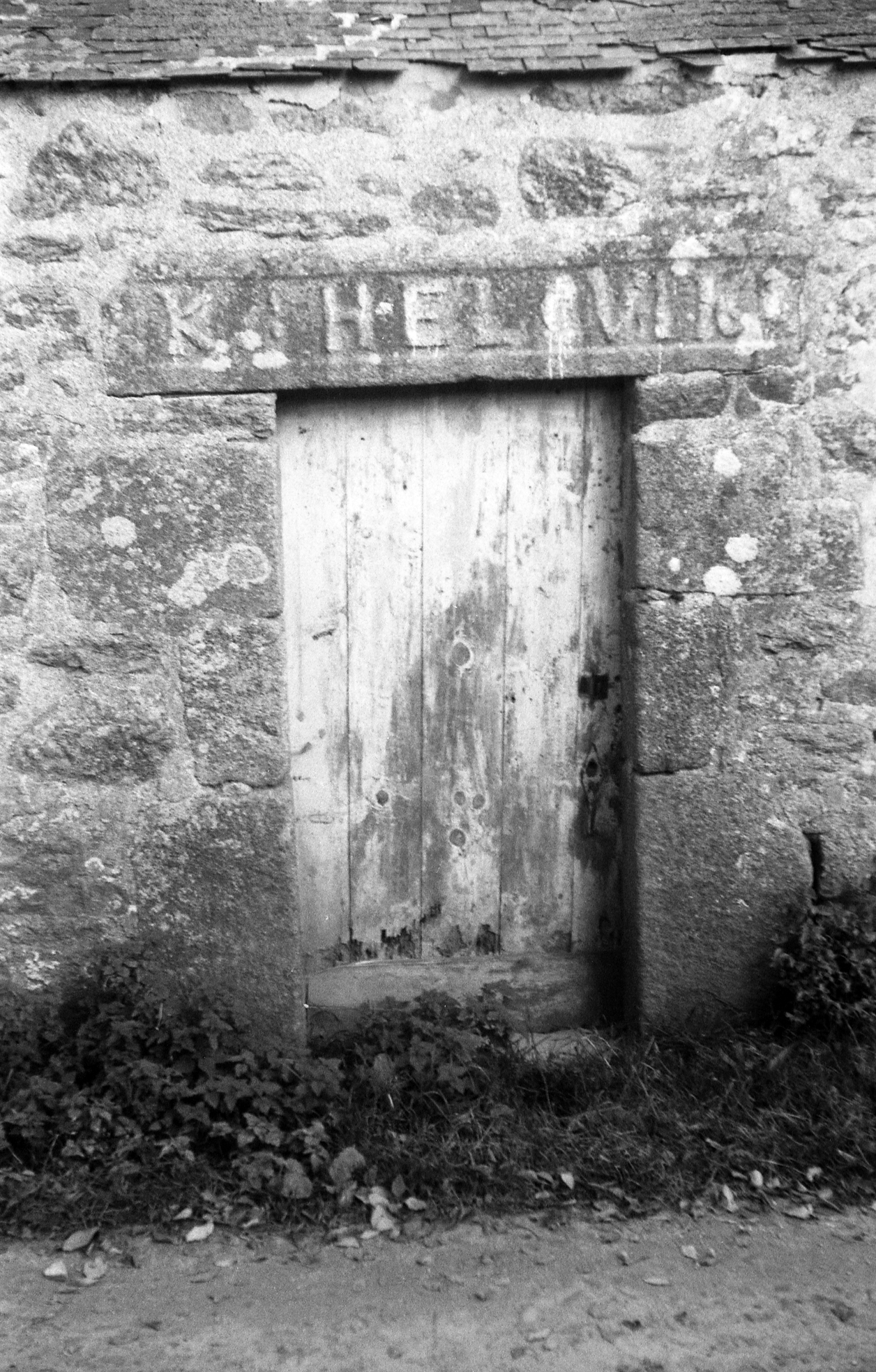 Maison 1 (ancienne crèche), élévation antérieure ouest du logis, détail de la porte d'entrée et inscription : K : HELOV / 1760. (1970)Immatriculation
