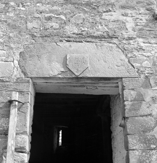Ferme, La Boulais, Façade sud, vue de détail du linteau de la porte d'entrée.Immatriculation