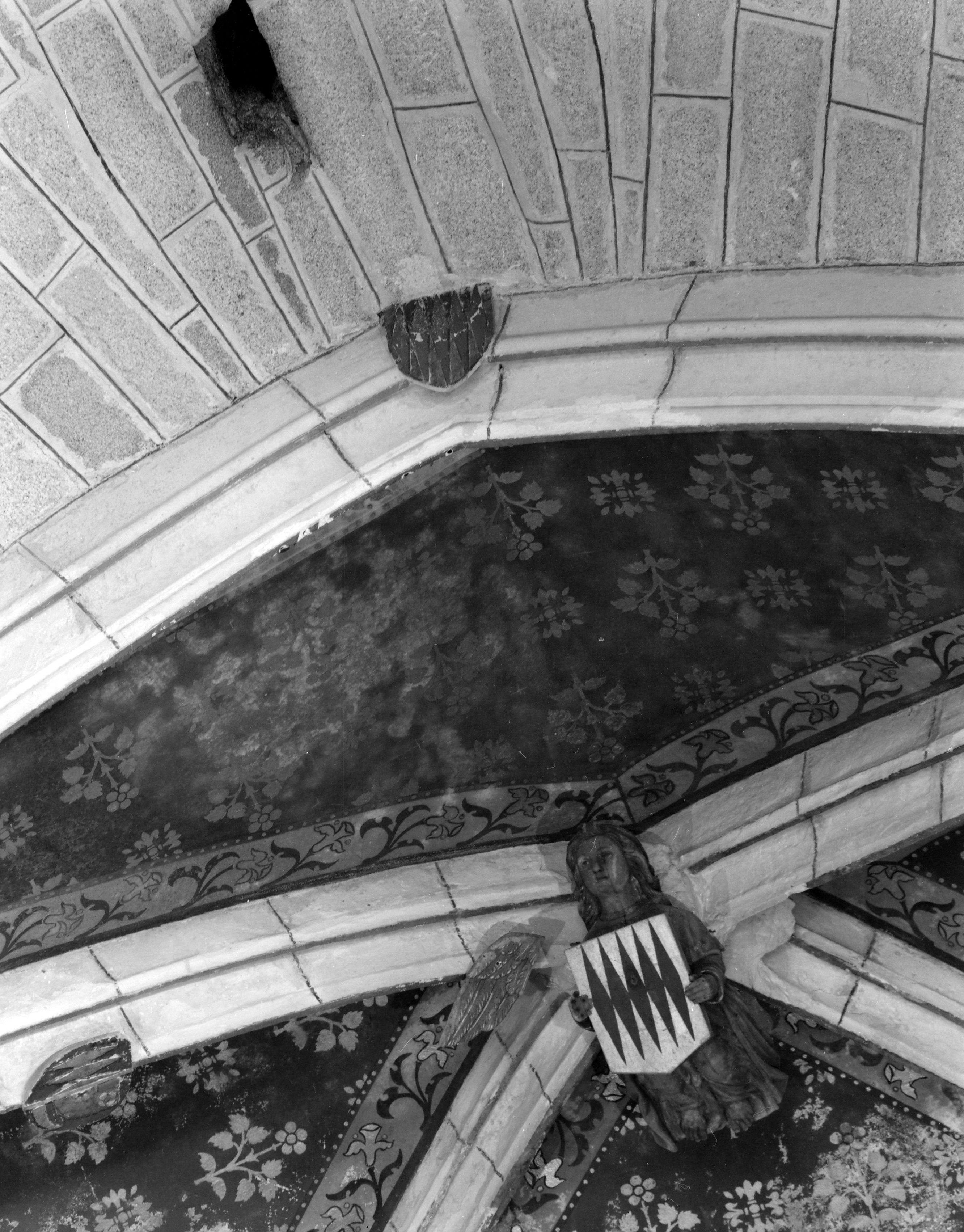 Ange tenant un écu aux armes des Boutteville à la clé de voûte du choeur et écu situé à la clé de l'arcade.Immatriculation
