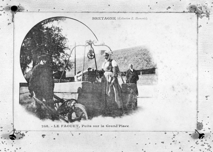 Carte postale ancienne - Helles et ancien puits sur la place (Archives départementales d'Ille-et-Vilaine, Fonds Des Bouillons 7 Fe 57).Immatriculation