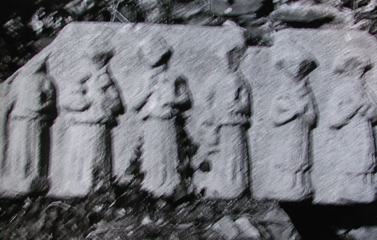 Vue du bas relief de la fontaine Sainte-Anne datée de la fin du 15ème siècle : remarquer les 6 personnages en habits religieux (Nicole Chouteau, 1971)Immatriculation