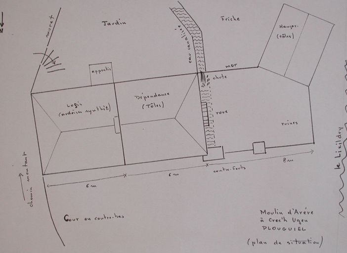 Plan de situation des bâtiments de l'ancien moulin et ses dépendances (Nicole Chouteau, préinventaire, 1971)Immatriculation