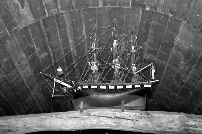 Vue de l'ex-voto de la chapelle Saint-Nicolas : maquette de trois-mâts voiles carrées, posée sur une poûtre (Chouteau, Nicole, ADAGP, 1971)Immatriculation