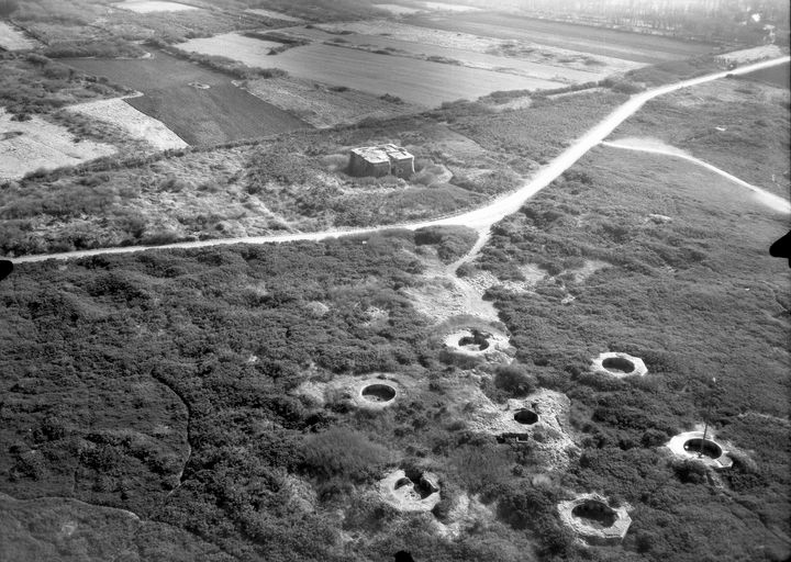 Vue aérienne de la batterie antiaérienne de Cornouaille en 1971. Au deuxième-plan : la tour-modèle n° 1 type 1811Immatriculation