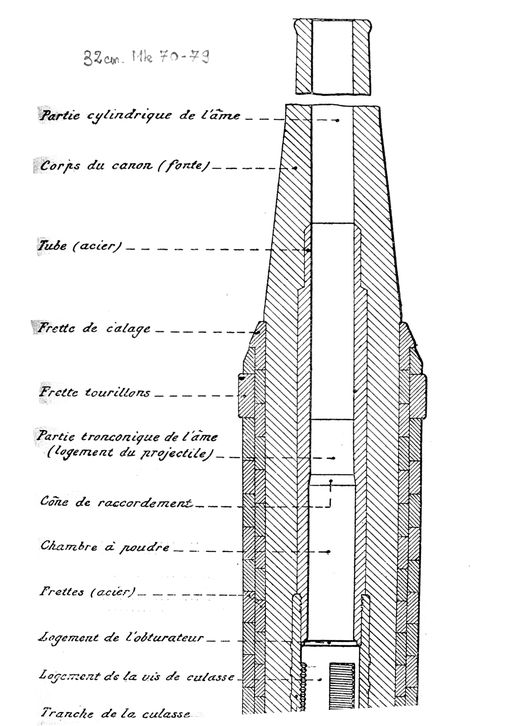Coupe d'un canon de 32 cm modèle 1870-1879 (armement de la batterie extérieure du Portzic sur affût M modèle 1876-T-83 PA)Immatriculation