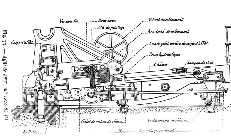 Plan détaillé d'un affût modèle 1876-1883 PA pour canon de 32 cm (armement de la batterie extérieure du Portzic)Immatriculation