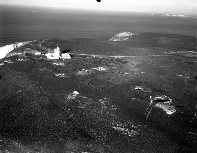 Vue aérienne du cap de la Chèvre prise de l'Est en 1971 : sémaphore en construction, fouilles d'ouvrages allemands inachevésImmatriculation