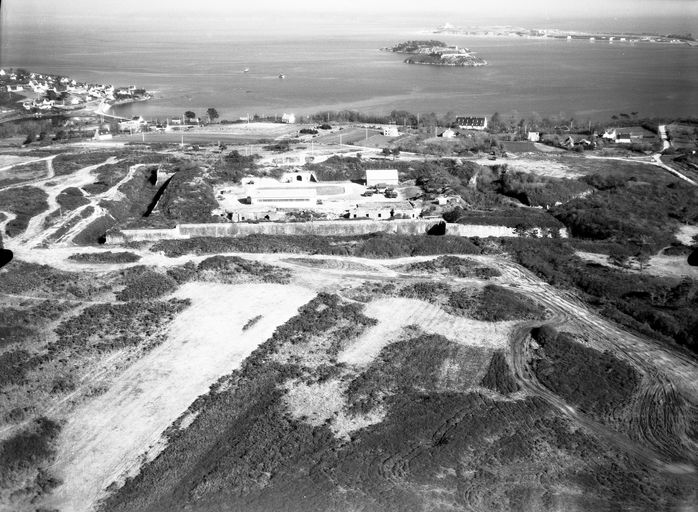 Vue aérienne du réduit de Quélern en 1971 prise dans l'alignement des anciennes lignes de Vauban. En arrière-plan : la caserne SourdisImmatriculation