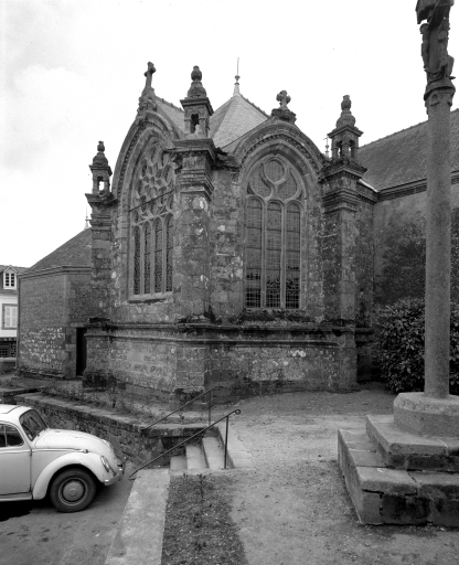 Plomodiern, église paroissiale Saint-Mahouarn : façade est, chevet, vue nord-est, état en 1972Immatriculation
