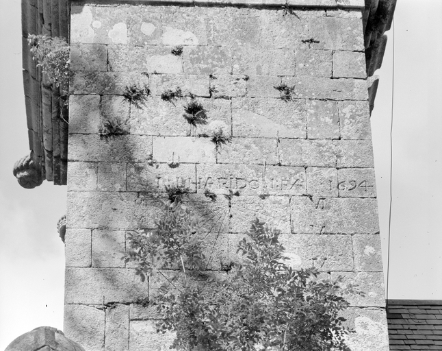 Clocher, face sud, détail cadran solaire et inscriptionImmatriculation