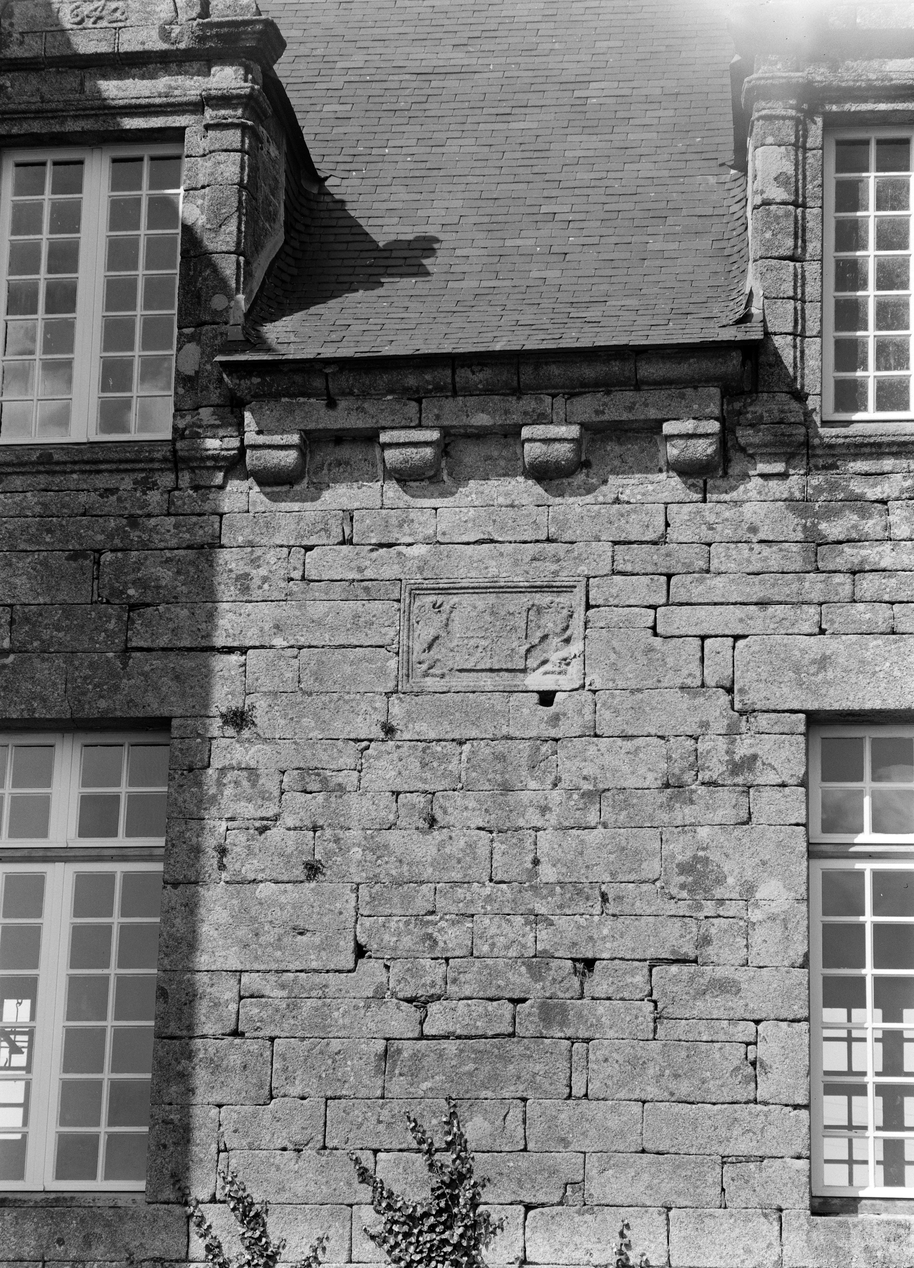 Façade sud partie centrale, détails appareillage de la corniche et panneau sculptéImmatriculation