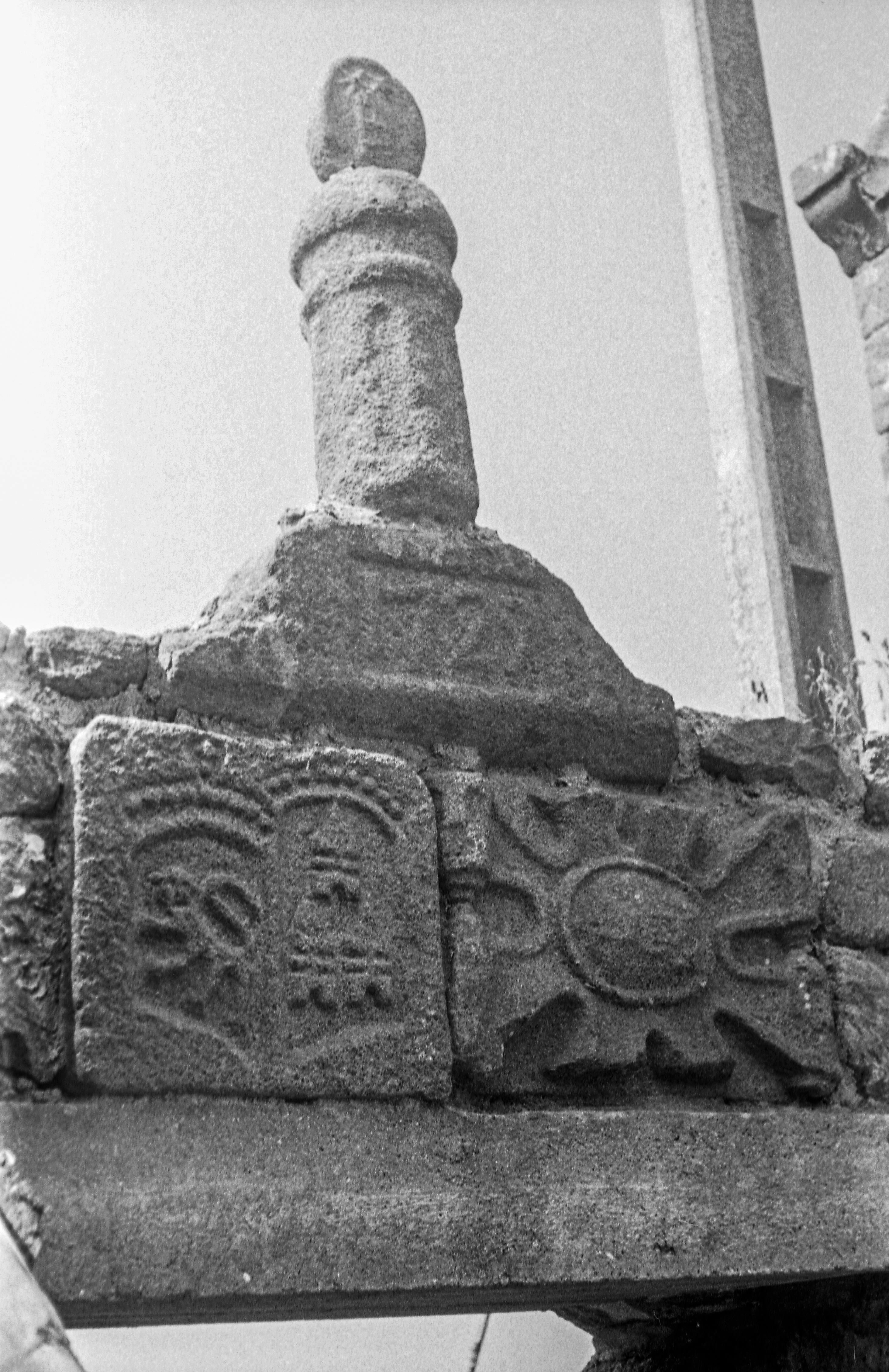 Manoir : pierres ornées de blasons remontées sur le mur de clôture nord (état en 1972)Immatriculation