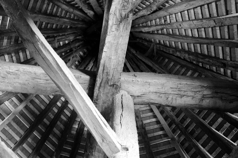 Tour d'escalier, charpente, vue générale.Immatriculation