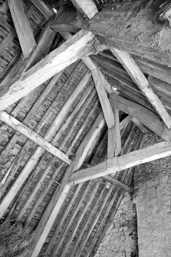 Logis, charpente, vue de détail d'une ferme.Immatriculation
