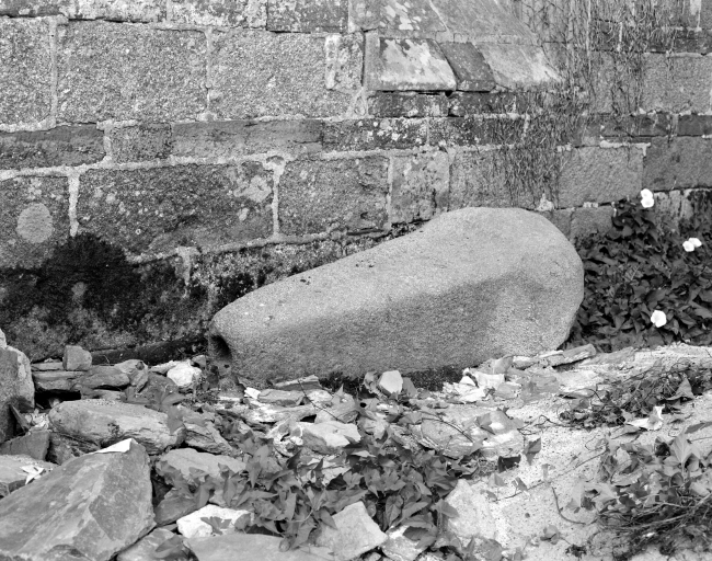 Pierre déposée contre le mur est du bras sud, dite pierre à poivre.Immatriculation